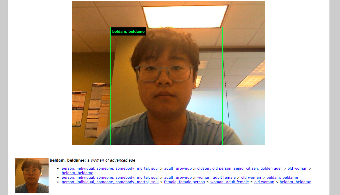 Imagenet first identified me as a beldam which is a woman of advanced age, as well as grandma, and a flibbertigibbet which is a female fool. Last picture I took I was identified as a pharoah.