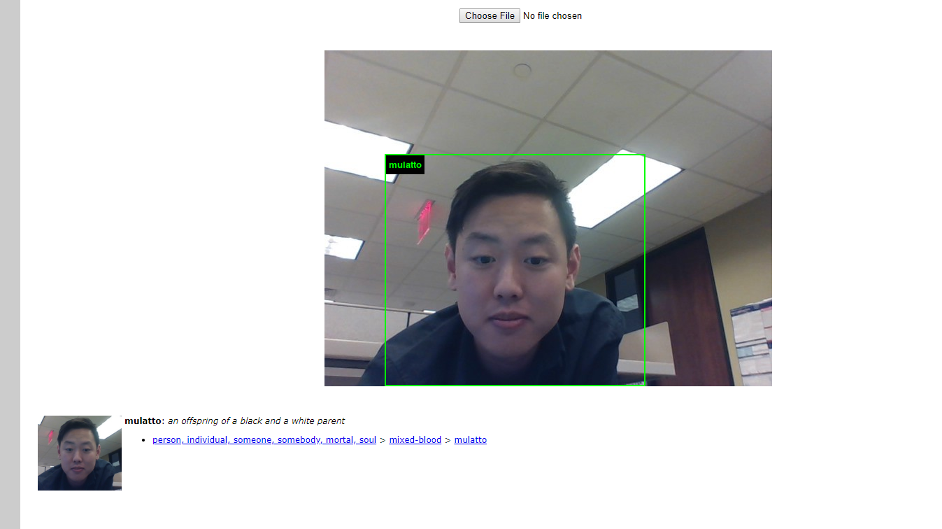 I took a webcam shot of my coworker at work, because he had never heard of Imagenet. I thought it was really funny because it wouldn't identify him as anything other than a mulatto("offspring of a black and white parent"). He is Malaysian, so I don't understand how LOL.